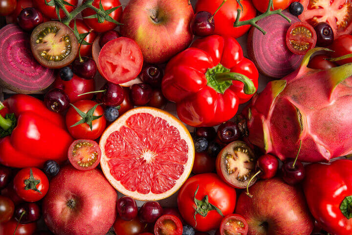 붉은색을 띠는 과일에는 루비 레드 자몽, 타트 체리, 라즈베리, 딸기, 수박, 자두, 복숭아 등이 있습니다.