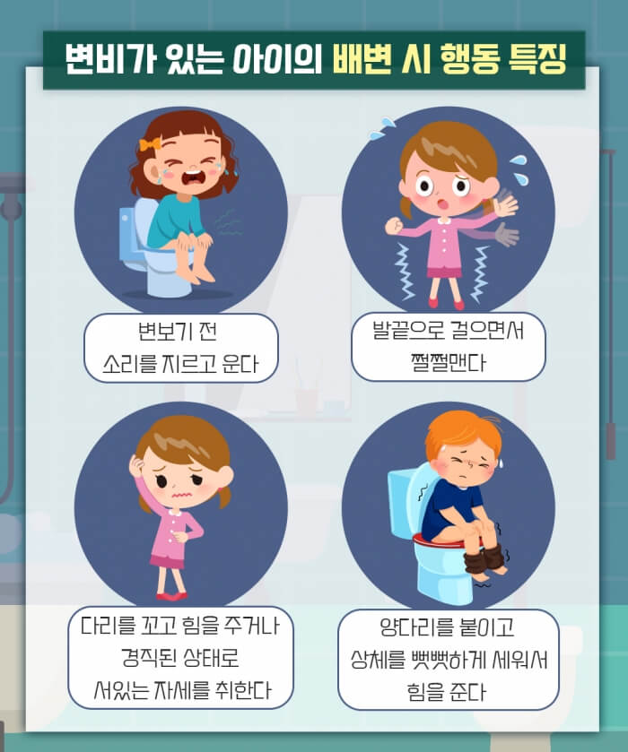 직관적으로는 ‘아이가 대변을 힘들게 보거나 변을 참는 증상 자체’로 소아 변비를 진단합니다.