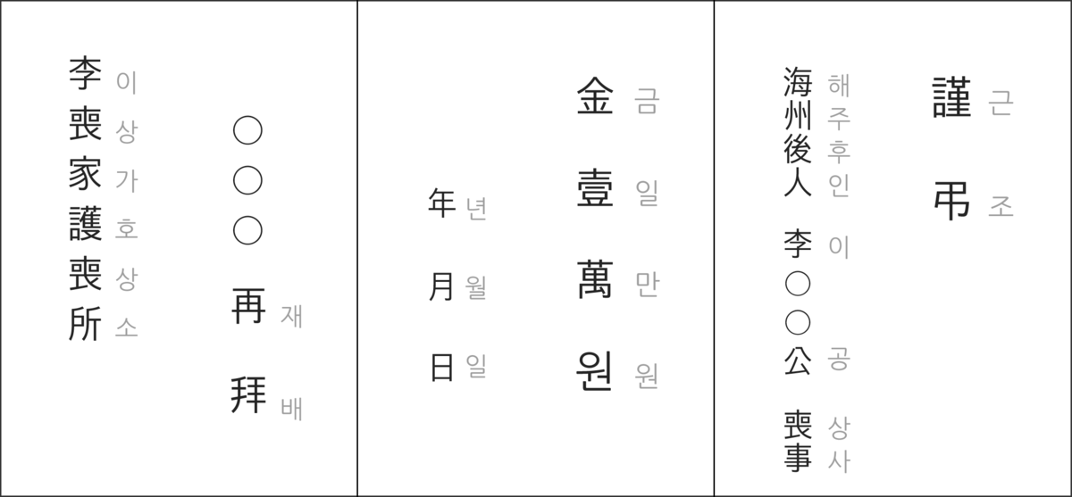 • 부조하는 사람의 이름 뒤에는 아무것도 쓰지 않아도 되지만 '근정(謹呈)', '근상(謹上)'이라고 쓰기도 합니다.