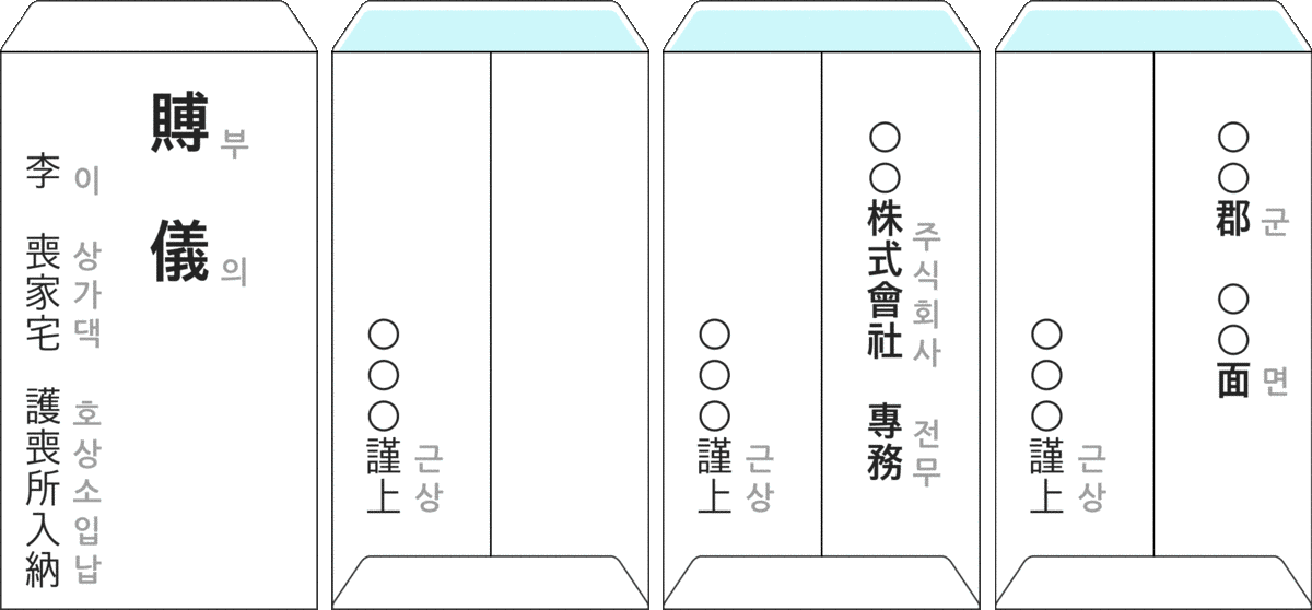 • 조의금 봉투에는 '부의(賻儀)'라 쓰는 것이 가장 일반적이며, 이외에 '근조(謹弔)', '조의(弔儀)', '전의(奠儀)', '향촉대(香燭代)'라고 쓰기도 합니다.