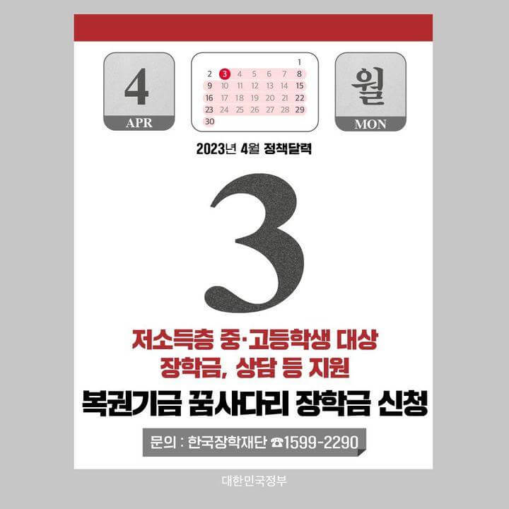 4월 3일부터 교육부와 한국장학재단에서 2023학년도 복권기금 꿈사다리 신규 장학생을 선발합니다.