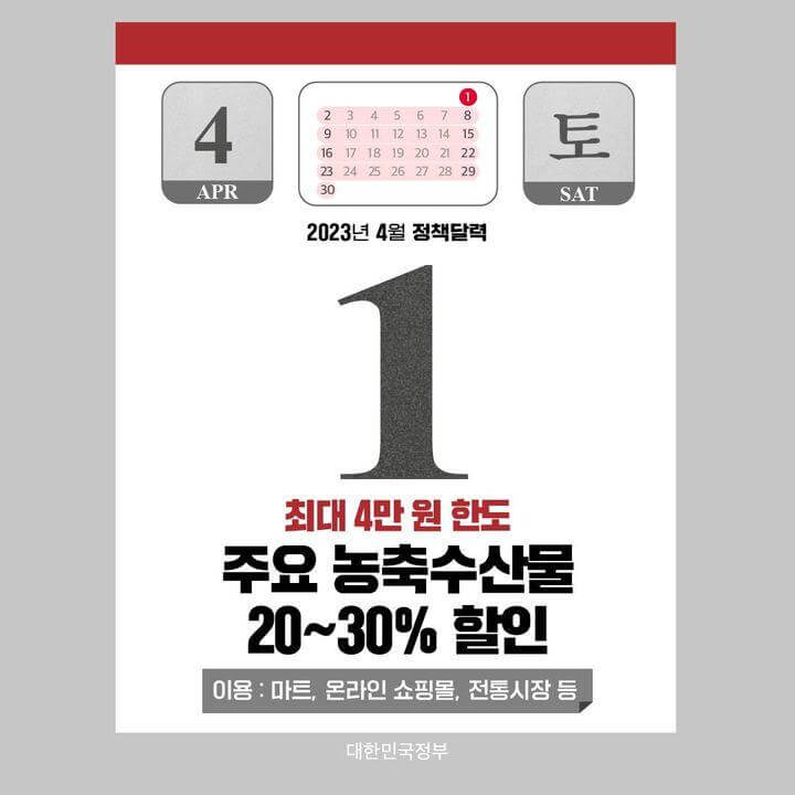 - 소비자 부담이 높은 주요 농축수산물 품목에 대해 170억원 규모의 할인지원*(4~6월) 실시
