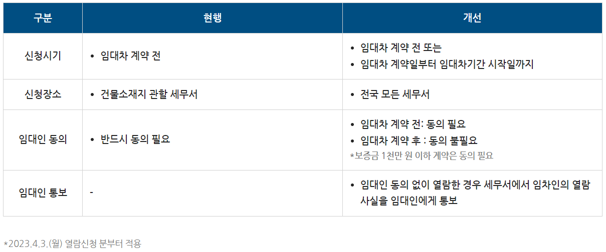 - (현행) 임차예정인이 임대차 계약 전에 임대인의 동의를 받아 임차할 건물소재지 관할 세무서에서만 열람신청 가능