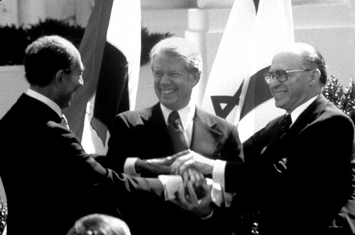이듬해 사다트-메나헴 베긴 이스라엘 총리-지미 카터가 미국 캠프데이비드 대통령 별장에서 손을 잡았습니다.
